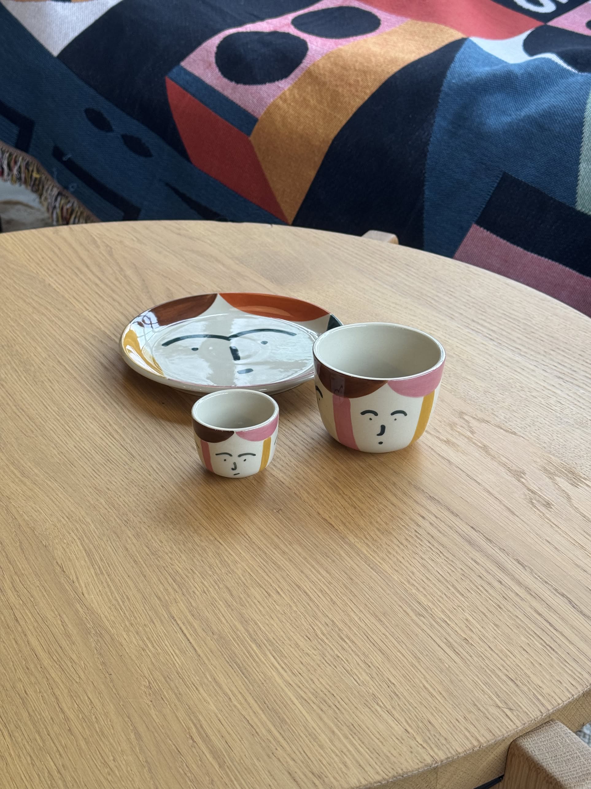 Open media in modal Donna Wilson Freya Face Pinch Pot Open media in modal Donna Wilson Freya Face Pinch Pot Open media in modal A hand in a purple sleeve holds the Donna Wilson Freya Face Pinch Pot—a small ceramic cup with a simple hand-painted stoneware face—over a light wooden table marked by a subtle grain. Open media in modal The Donna Wilson Freya Face Pinch Pot, featuring a hand-painted illustrated face, sits with other stoneware pieces on a light wooden table, complemented by Donna Wilson’s colorful abstract-patterned blanket in the background. Open media in modal A shelf displays a green plant, a ceramic plate, two Donna Wilson Freya Face Pinch Pots with abstract faces, and a textured white vase holding yellow flowers, all set against a light wood background.