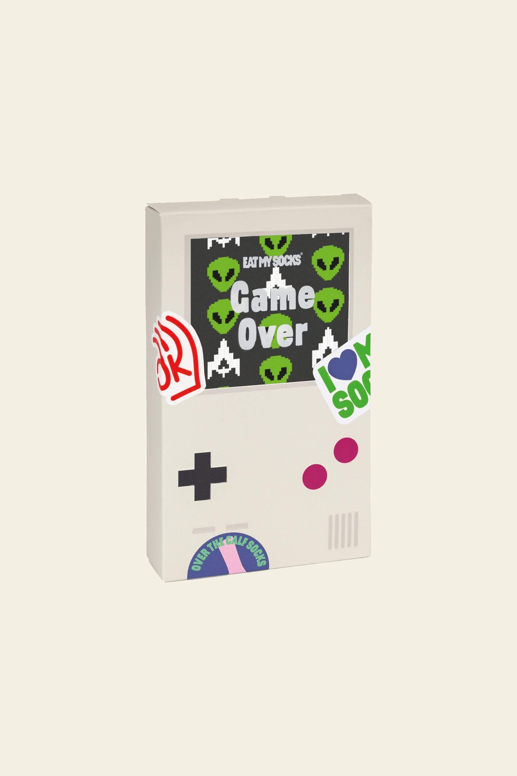 Eat My Socks Game Over Socks – a nostalgic and playful pair of over-the-calf socks perfect for video game lovers or anyone who fondly remembers their Gameboy days. These socks bring a fun, retro vibe to any outfit.