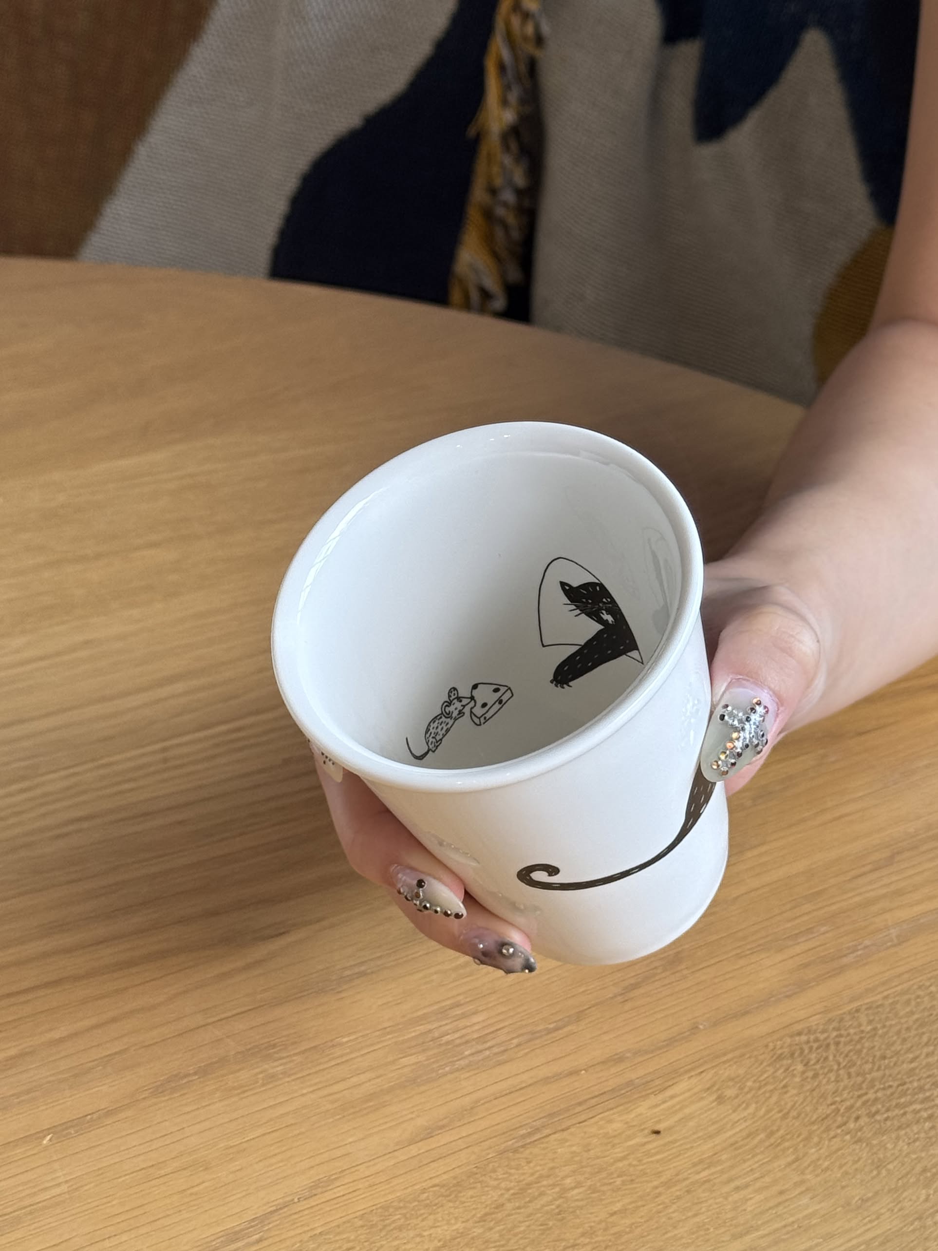 helen b Millie & Vanillie Cup – playful, minimal, and full of story, the Millie & Vanillie Cup brings helen b’s signature humour to your daily routine. On the outside, a curious cat peeks into a mysterious hole; inside the cup, a tiny mouse sits comfortably, nibbling on cheese. Every sip reveals a little more of this charming scene.