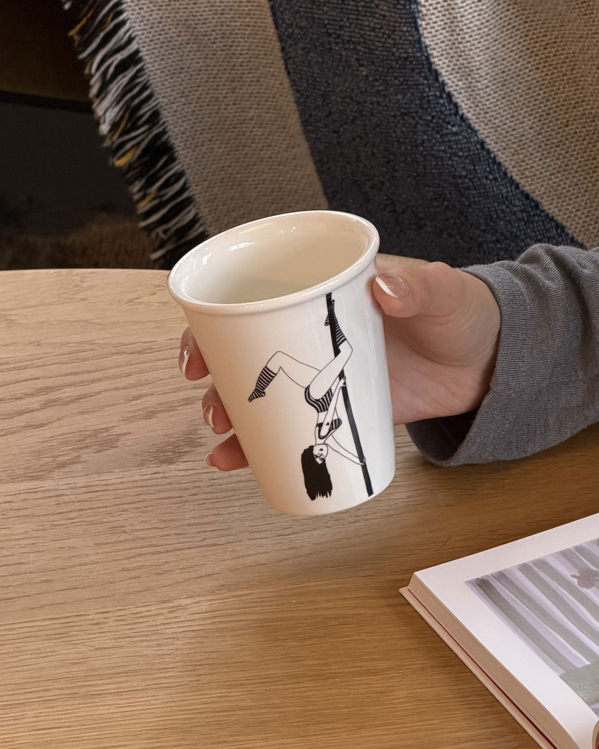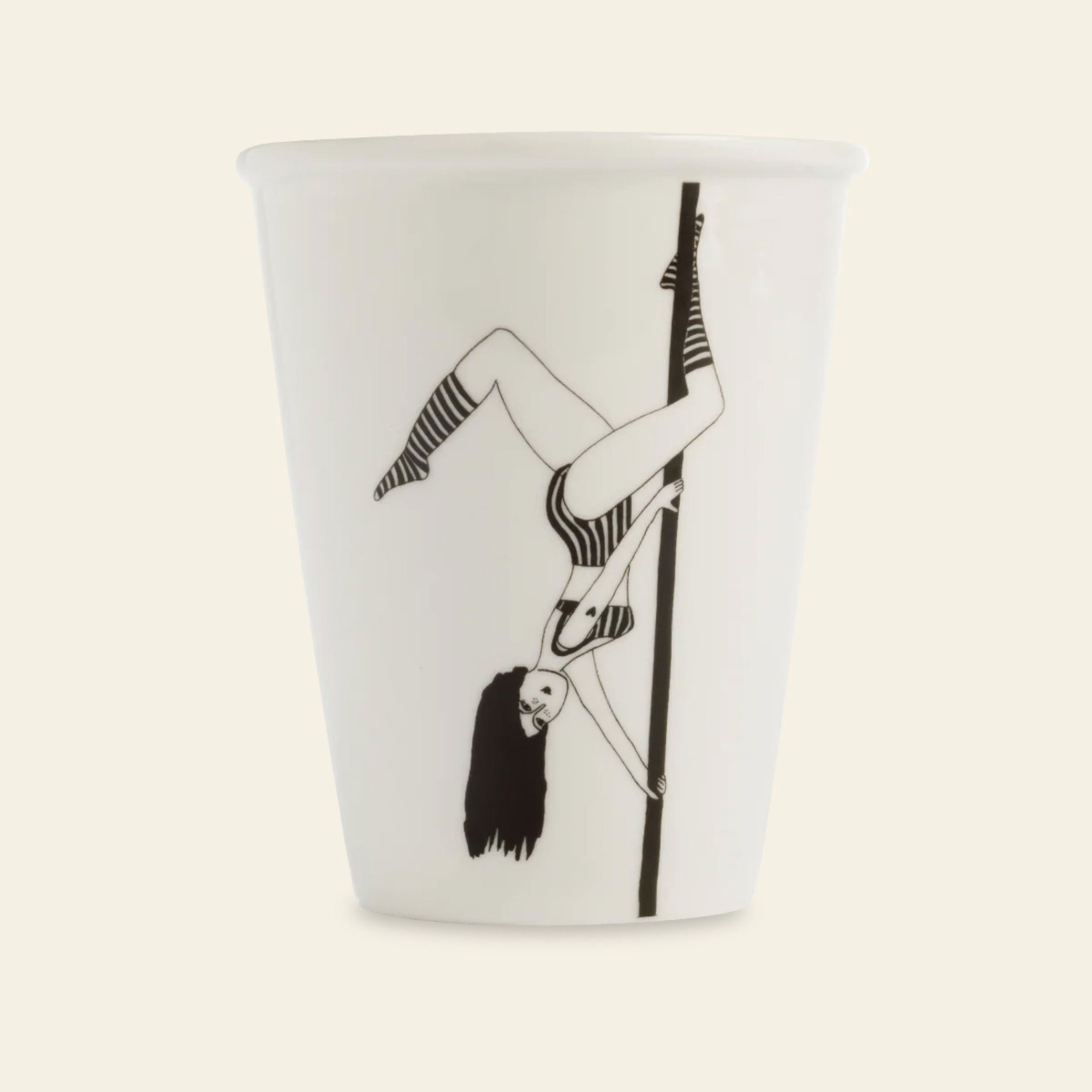 helen b Pole Dancer Cup – a playful porcelain cup featuring a confident pole dancer illustrated in helen b’s signature black-line style. Bold, cheeky, and full of personality, it’s perfect for anyone who enjoys humour with their coffee or tea.