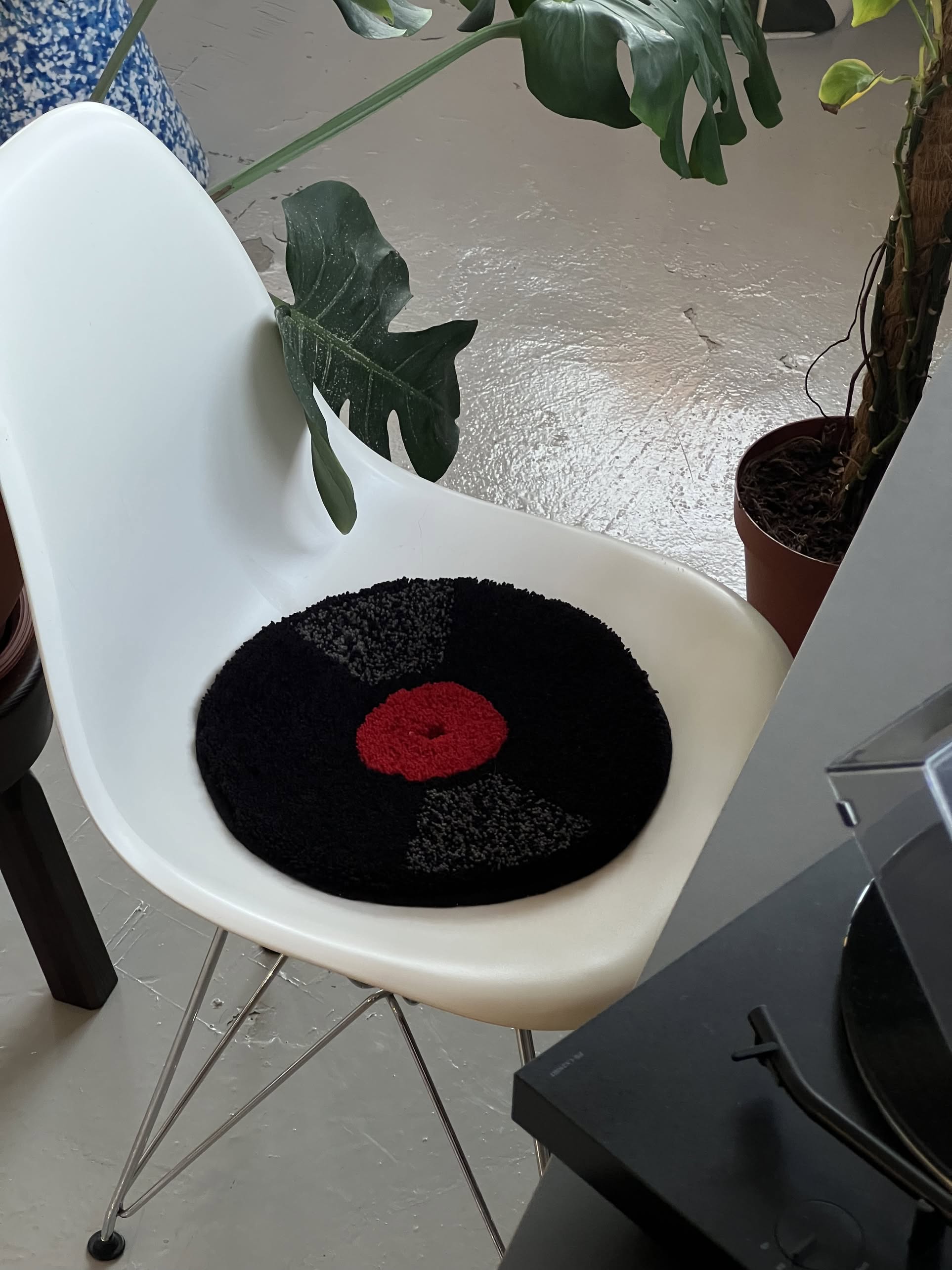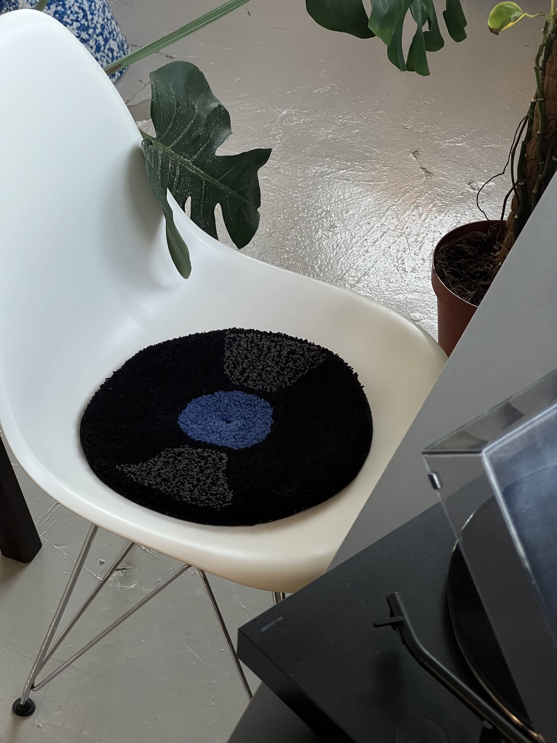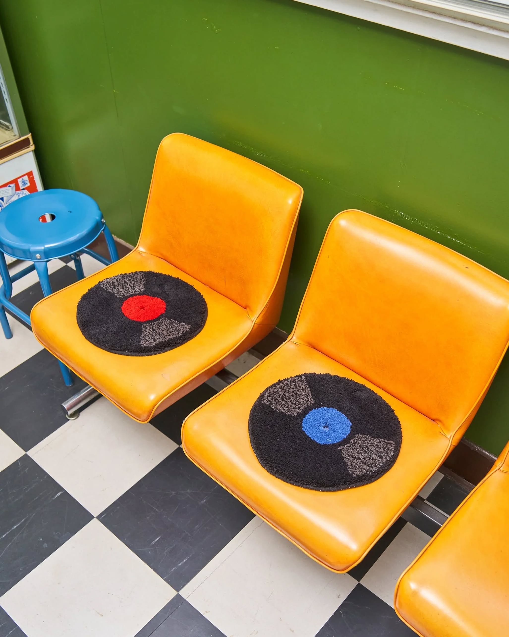 MIYOSHI RUG Record Chair Rug Compact and full of character, this 30 x 30 cm rug is inspired by the iconic look of a vinyl record, reimagined in vibrant blue or bold red. Perfect as a chair mat, decorative accent, or even wall art, its graphic design adds a playful retro touch while offering everyday comfort.