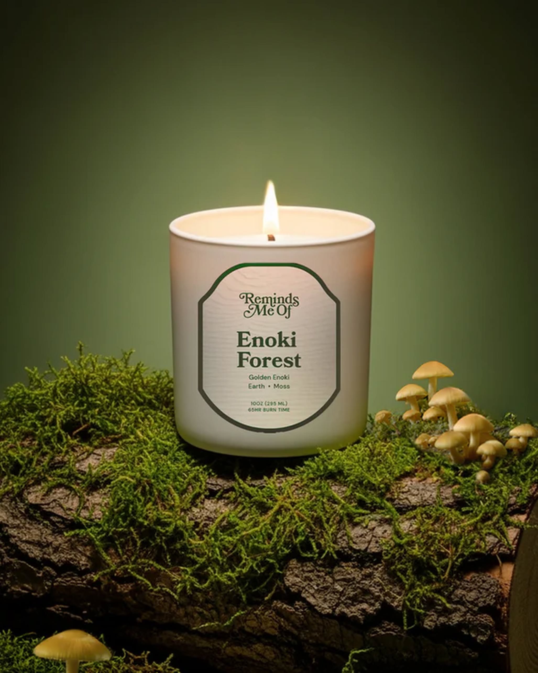 Reminds Me Of Enoki Forest Candle - walk along a forest floor carpeted in golden leaves, where delicate enoki mushrooms rise and mingle with earthy moss, clove leaf, and cedarwood. This warm, earthy-fresh candle captures the subtle musk and layered textures of a forest in autumn.