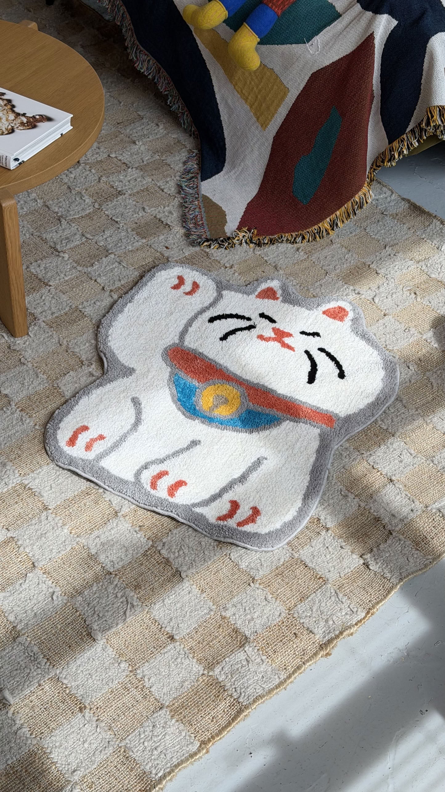 Stacked Store Fortune Cat Rug – Designed by Stacked Store and inspired by the iconic lucky cat (Maneki-neko), this playful rug brings charm and positive energy into any space. With its cheerful expression and soft velvet texture, it adds a fun decorative touch to bedrooms, entryways, or cozy corners.